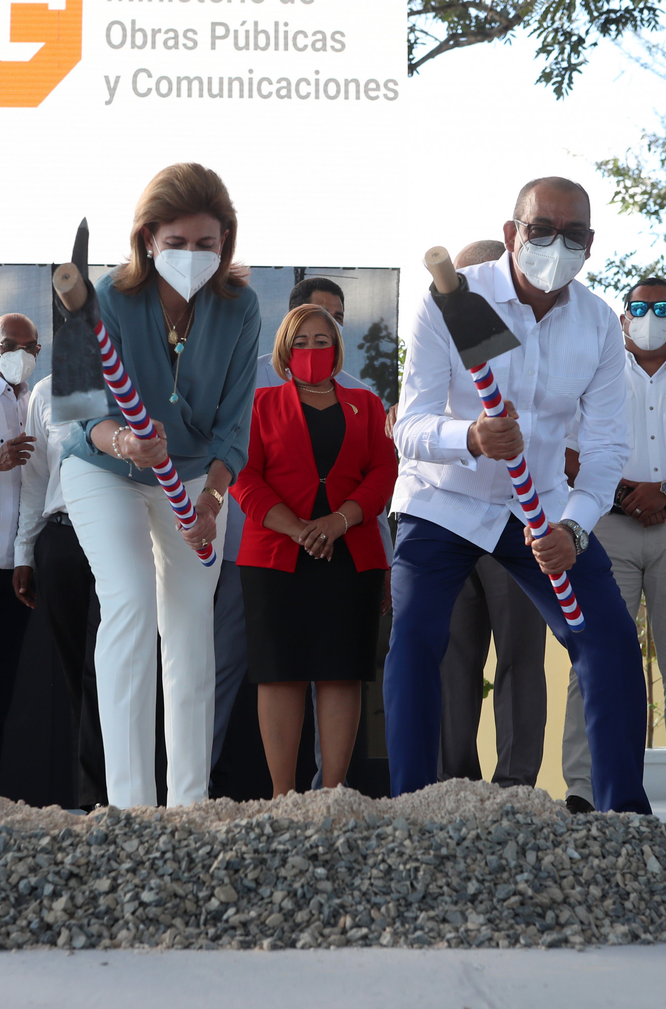 La vicepresidenta Raquel Peña realiza el primer picazo para dar inicio a la construcción de la Oficina Regional del Ministerio de Obras Públicas y Comunicaciones, junto al ministro Deligne Ascención y demás miembros de la mesa de honor. en Higüey, La Altagracia. República Dominicana. 27 de Noviembre del 2020. V/P Ricardo Roja